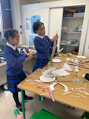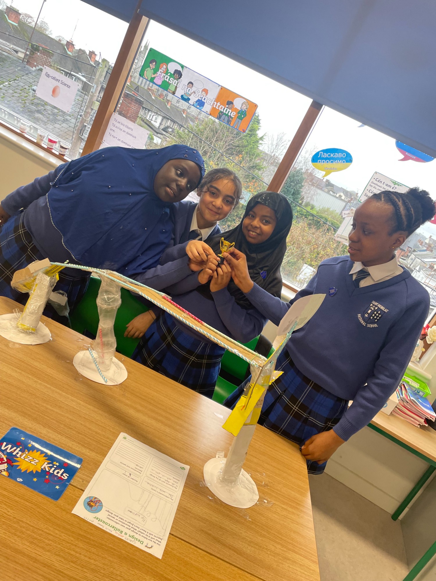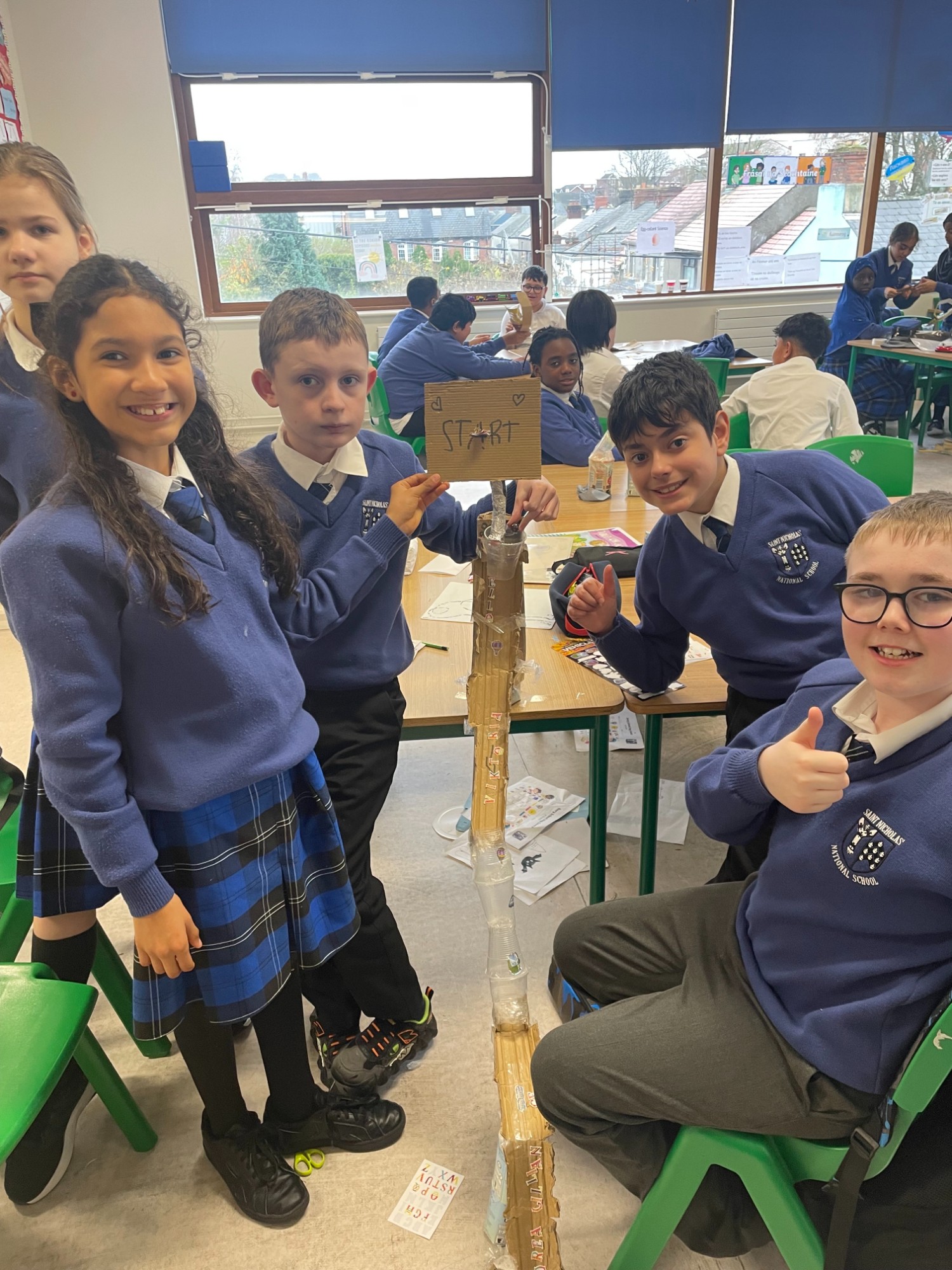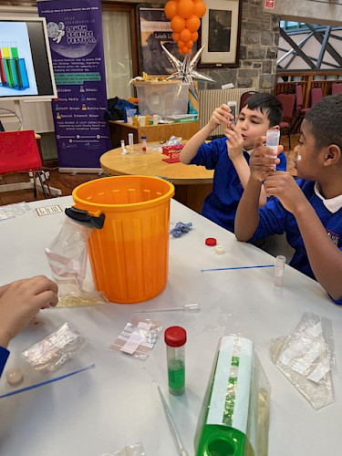 高年级幼儿班和一年级学生参加了 STEM 挑战赛,用以下材料搭建一个结构,尽可能多地从熔岩中救出小熊:3 个杯子、4 根棒棒糖棍和一张卡片。他们想出了很多拯救小熊的办法!二班和三班进行了一项实验,看看谁能吹出最多的泡泡。作为科学周的一部分,特雷纳老师的三班和四班在邓多克图书馆参加了 DNA 工作坊。孩子们了解了 DNA 的所有知识,并从香蕉中提取 DNA,玩得不亦乐乎。孩子们在参观过程中还阅读了一些科学书籍。他们都玩得很开心。四班和五班的孩子们尝试了抓泡泡和反弹泡泡,并参加了泡泡奥运会,通过实验看谁能吹出最大的泡泡。他们还用最快的速度接住了掉落的尺子,测试了大脑的反应速度。他们还参加了科学、技术和工程学(STEM)挑战赛,比赛项目包括制作最棒的飞行纸飞机,以及设计和制作降落伞,让鸡蛋从高处安全落到地面。五班和六班通过 Zoom 参加了 RTÉ 的科学周启动仪式。他们将鸡蛋放入不同的液体中,观察不同液体对牙齿的影响。在科学、技术和工程挑战赛中,他们制作了过山车。
