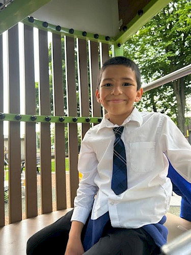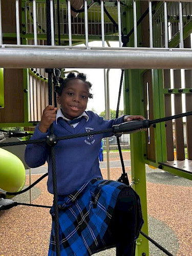 a swing set in a park with a building in the background. Photo by Ewa Anderson, Unsplash.