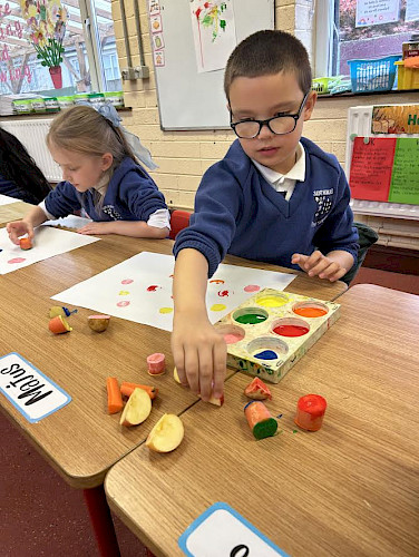 Clasa doamnei Taggart s-a distrat de minune explorând perioada recoltei prin artă! Au folosit cartofi, morcovi și mere pentru a realiza printuri și picturi colorate. De asemenea, au sculptat un dovleac și chiar au creat propriul lor dovleac vulcan eruptiv! Toți s-au distrat de minune!